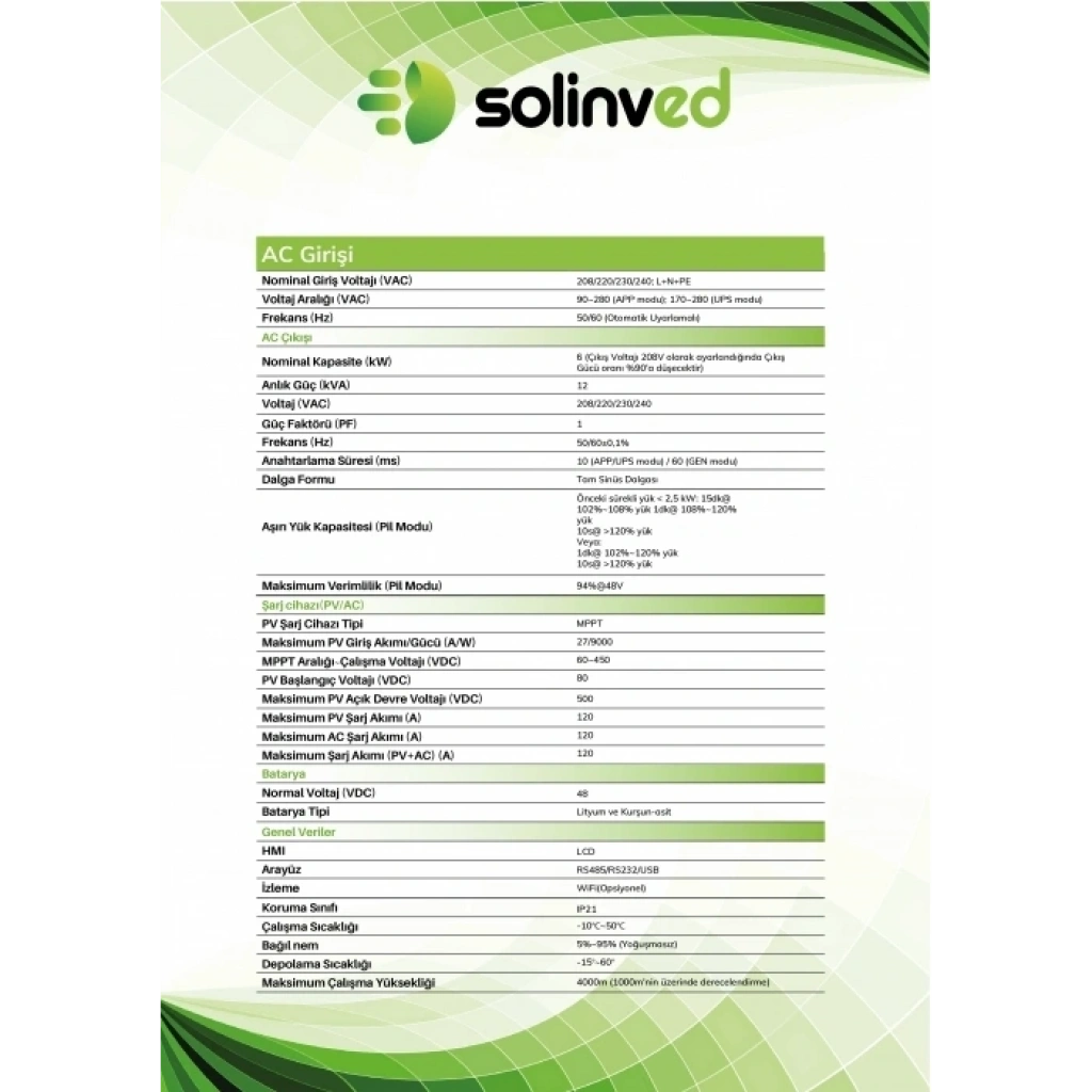 Solinved 6.0 kW Gordion Serisi MPPT Off-Grid İnverter – Tam Sinüs, Yüksek Frekans, WiFi İzlemeSolinved 6.0 kW Gordion Serisi Off-Grid İnverter, yüksek frekanslı tasarımı, geniş MPPT aralığı ve bataryasız çalışma yeteneği ile modern off-grid sistemlerin ihtiyaç duyduğu tüm özellikleri tek cihazda sunar. 60–450V geniş MPPT aralığı, 9.000W PV desteği, tam sinüs AC çıkışı, çift AC çıkışı ve gelişmiş BMS iletişimi (CAN/RS485) sayesinde hem konut hem de ticari off-grid projelerde yüksek verimlilik ve tam enerji bağımsızlığı sağlar. Dahili WiFi sayesinde inverter; telefon uygulaması üzerinden anlık izlenebilir, geçmiş veriler görüntülenebilir ve uzaktan kontrol edilebilir.