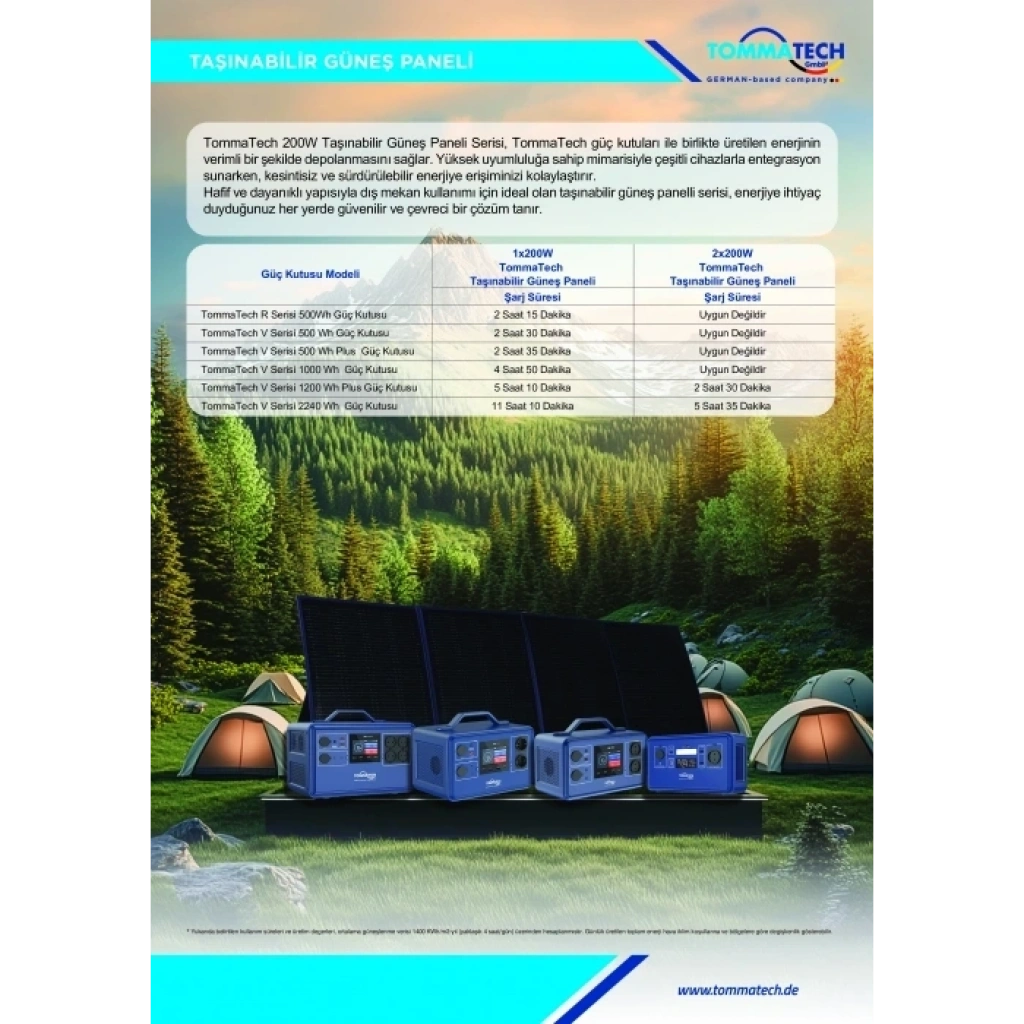 TommaTech 200W katlanabilir panel, birçok taşınabilir güç istasyonu ve solar şarj cihazı ile uyumludur. MC4 bağlantıları sayesinde invertör, şarj kontrol cihazı veya power station ile sorunsuz çalışır.