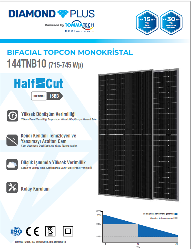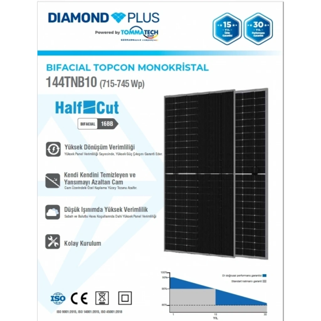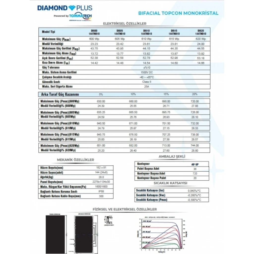 TOMMATECH DİAMOND PLUS 620W 144 HÜCRE BİFACİAL TOPCON GÜNEŞ PANELİ