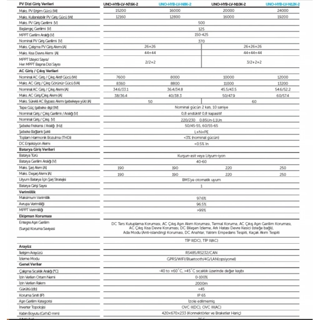 %97,6 maksimum verim ve %96,5 Avrupa verimliliği ile çalışan inverter, gelişmiş MPPT algoritması sayesinde güneş enerjisinden en yüksek faydayı sağlar. DC ve AC tarafında kısa devre, aşırı akım, aşırı sıcaklık, ters kutup ve ada modu korumaları ile sistem güvenliğini üst düzeyde tutar.